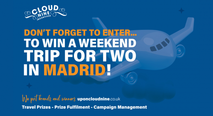 *Terms apply. UK residents 18+ only. Ends 23:59 BST 14/10/23. No purchase necessary. Internet access required. To enter prize draw, participants need to complete the competition post form available on www.uponcloudnine.co.uk/competition. One entry per person. 1 x prize of a trip to Madrid for 2, return flights from a UK airport, 2 nights 4 hotel sharing a twin room. Specific travel terms apply. Promoter: Cloud Nine Incentives Ltd. Visit www.uponcloudnine.co.uk/competition for full terms.